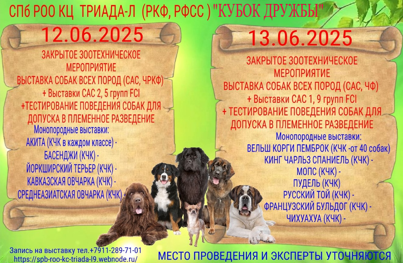 Кинологический Центр Триада Л, Приглашает Вас и ваших питомцев принять участие в наших выставках проводимых в системе РКФ. Вас ждёт дружественная атмосфера и положительные эмоции. В рамках выставки проводится ТЕСТИРОВАНИЕ ПОВЕДЕНИЯ СОБАК ДЛЯ ДОПУСКА В ПЛЕМЕННОЕ РАЗВЕДЕНИЕ (Т1.) , и конкурсы с подарками. Для записи на нашу выставку Обращайтесь на e-mail: kamalakshmi@yandex.ru